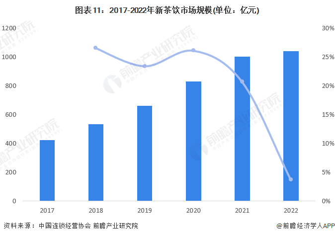 根据中国连锁经营协会数据,我国新茶饮市场规模从2017年的422亿增长至2021年的1003亿元,年复合增长率在20%以上。2020-2022年市场规模增速受到疫情影响波动下滑,初步估测2022年新茶饮市场规模为1040亿元,基本与2021年持平。