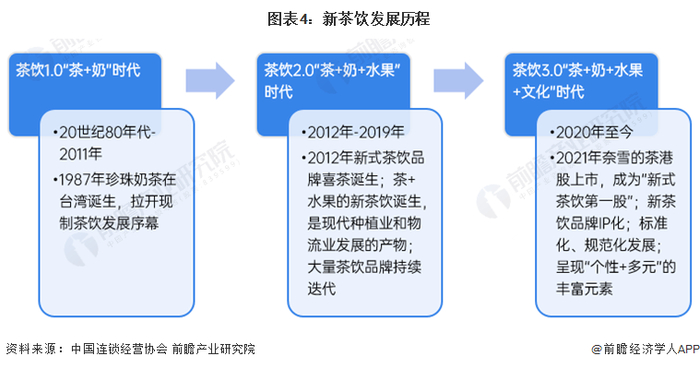 新茶饮历经三十余年的发展,大致经历了三个发展阶段:茶饮1.0“茶+奶”时代,即1990年及以前珍珠奶茶快速发展阶段;茶饮2.0“茶+奶+水果”时代,主要在2012年-2019年,即新茶饮诞生阶段,大量茶饮品牌持续迭代;而目前,已发展至茶饮3.0“茶+奶+水果+文化”时代,期间资本推动行业进一步快速发展,疫情加速行业洗牌,供应链的发展、人才的涌入、数字化运营建设都成了品牌发展的关键性因素。
