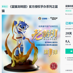 一个月前的5月7日,一代童年经典IP蓝猫宣布回归,蓝猫系列官方微博官宣将一如既往推出优质的动漫故事,并打造中国动漫第一组“群体英雄形象”国漫科幻大片《蓝猫龙骑团》第4季系列手伴第1弹“蓝猫一飞冲天”,蓝猫官方在摩点网开启了该手办的众筹计划。截止到今日刚好一个月的时间,众筹的情况相当不乐观,目标金额30万元,目前已筹到2304元,完成目标0.77%,距离目标结束还有28天,现在仅有8人付费购买了这款手办。