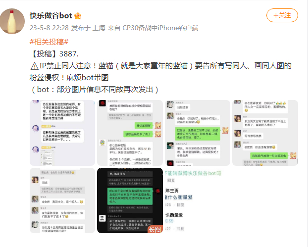 在蓝猫系列官方刚宣布重启IP就在“二创”上踩了粉丝的“雷点”。5月8日有人向微博@快乐做谷bot投稿,称在蓝猫动漫的群中,蓝猫动漫IP官方明确表示了不支持粉丝二创,投稿者称“蓝猫要告所有写同人、画同人图的粉丝侵权。”在群聊截图中,蓝猫动漫IP官方称“蓝猫要重启,第一个就是维权。”“蓝猫官方被侵权10多年,周边侵权高达几十亿,不然,有更多好动漫推出来。”