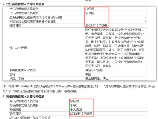 2022年12月10日,公司公告称,于东升因个人原因于2022年12月9日离任总经理一职,由银河基金党委书记、董事长宋卫刚代任,此时距离其3月上任还不到一年。