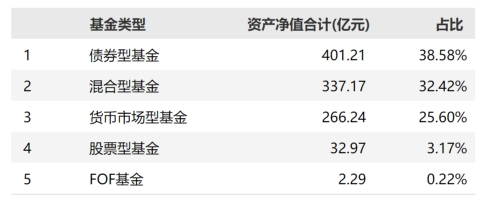 其中,非货规模达到773亿元,债券型基金为401.21亿元,占比38.58%,混合型为337.17亿元,占比32.42%。