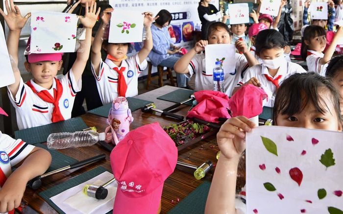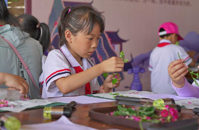 6月7日,小学生在迁安市乐丫研学与劳动实践教育基地,体验非遗技艺植物拓染。