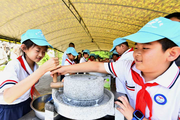 6月7日,小学生在迁安市乐丫研学与劳动实践教育基地,体验用传统方法磨豆浆。