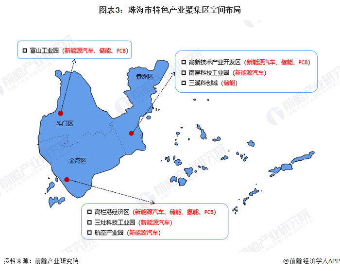 在产业聚集区的空间分布来看,新能源汽车产业在各区均有布局,氢能产业重点布局在金湾区,储能产业和印制电路板(PCB)产业分布较平均。