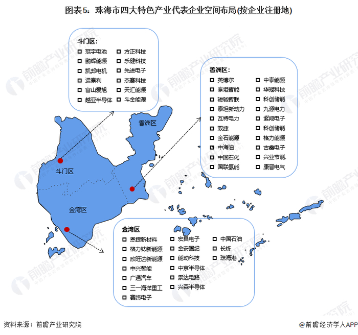 在企业空间布局方面,四大特色产业在各行政区均有布局。其中,香洲区代表企业最多,有泰坦新动力、国联氢能、紫翔电子等企业,金湾区有格力钛新能源、欣旺达兴能源、中兴智能等企业,斗门区有冠宇电池、方正科技、天汇能源等企业。