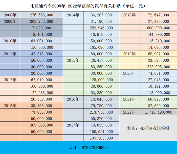 如上图,从2008年到2022年的15年间,经过翻阅年报累加,杠杆游戏计算出比亚迪汽车总计至少拿到了各类补贴、补助共计约67.84亿元。