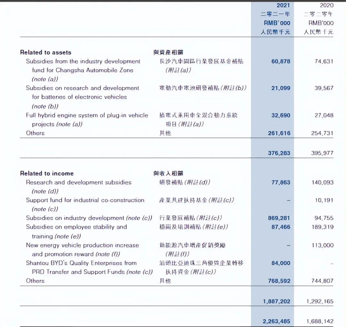 长沙比亚迪汽车252,946,000元确认为政府补助收入,由长沙雨花经济开发区管理委员会提供,旨在为汽车的研究与开发活动提供支持;