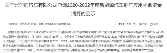 日前,西安市工信局发布了《关于比亚迪汽车有限公司申请2020-2022年度新能源汽车推广应用补助资金清算的公示》。