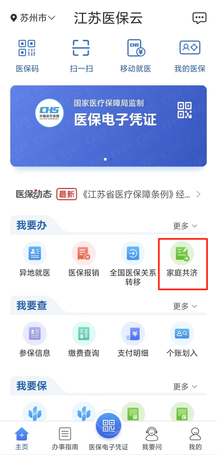 苏州市职工医保参保人可以在江苏医保云APP上为自己和家人办理“家庭共济”的绑定,也可以到医保经办机构窗口申请办理。