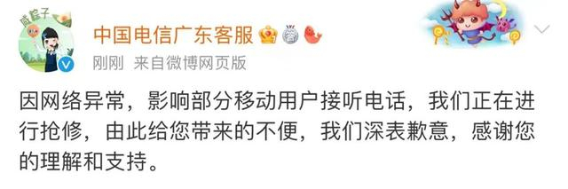 微博@中国电信广东客服 8日下午发文回应:因网络异常,影响部分移动用户接听电话,我们正在进行抢修,由此给您带来的不便,我们深表歉意,感谢您的理解和支持。