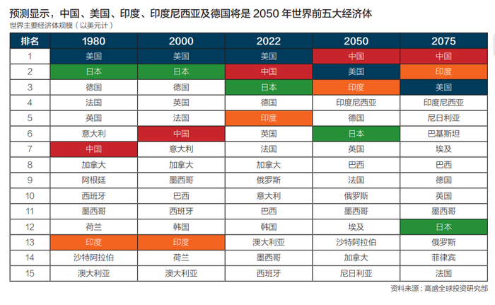 预计到2050年,高盛全球投资研究部认为世界前五大经济体将是中国、美国、印度、印度尼西亚和德国 ( 届时印度尼西亚将取代巴西和俄罗斯进入最大的新兴市场之列 )。