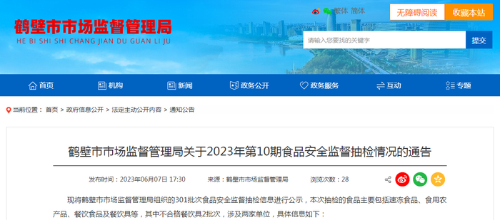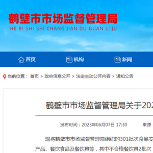 河南省鹤壁市市场监管局抽检301批次食品 2批次餐饮具不合格