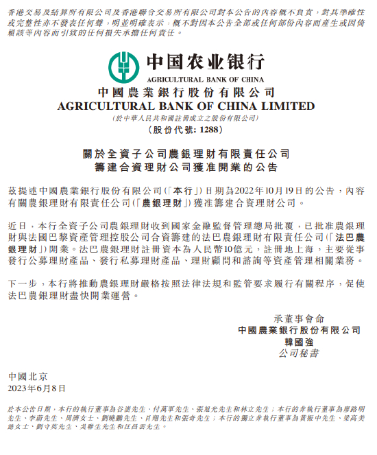 6月8日消息,农业银行在港交所公告,近日,该行全资子公司农银理财收到国家金融监督管理总局批复,已批准农银理财与法国巴黎资产管理控股公司合资筹建的法巴农银理财有限责任公司(法巴农银理财)开业。法巴农银理财注册资本为人民币10亿元,注册地上海,主要从事发行公募理财产品、发行私募理财产品、理财顾问和咨询等资产管理相关业务。