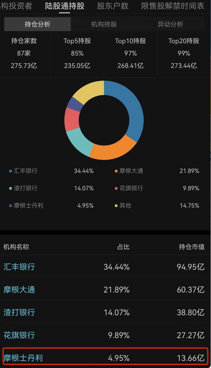具体来看,摩根士丹利持有隆基绿能股份在外资中排名第五,在北向资金持仓中占比为4.95%。同时,从摩根士丹利在A股持仓来看,隆基绿能排名第七,是光伏新能源赛道持股市值最高的个股。