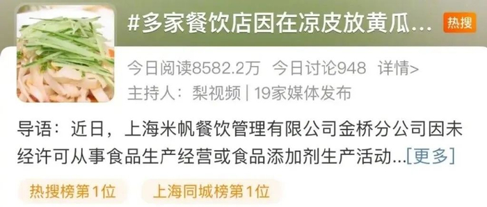 此外,上海市浦东新区金杨新村街道桌福小吃店、上海哆美汁餐饮管理有限公司等餐饮企业,也因未取得冷食类食品制售许可而销售含有黄瓜丝的凉皮被罚。