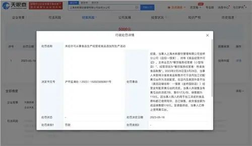 天眼查App显示,近日,上海米帆餐饮管理有限公司金桥分公司因未经许可从事食品生产经营或食品添加剂生产活动,被上海市浦东新区市场监督管理局罚款5000元。