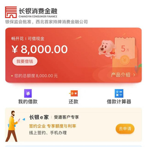 在长银消费金融App首页,提供的贷款产品包括“畅开花”“长银e家”“畅享贷(信用)”“车主专案”等。不同贷款产品的利率与贷款条件各有不同。不过,对于各项贷款产品的具体年化利率,长银消费金融并未在App首页进行直接展示,用户点击“去申请”后,方可在产品介绍页面查看年化利率区间。
