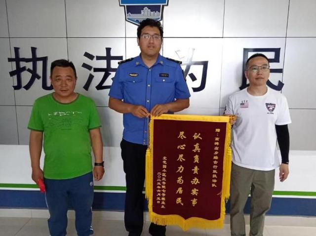 6月5日,北京朝阳区北花园小区三号院的几位居民来到北京朝阳区高碑店乡综合行政执法队,向队员们送上一面写着“认真负责办实事,尽心尽力为居民”的锦旗。