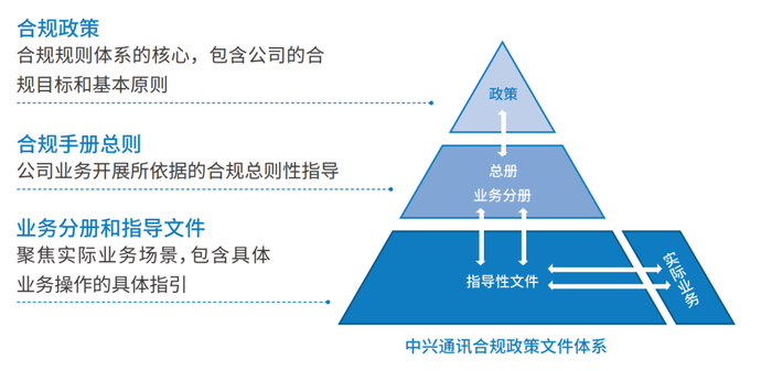 从2018 年开始,中兴通讯就建立了层层递进且相互援引金字塔式的合规规则体系,从合规政策、原则性规范、流程规范到嵌入业务流程中的关键控制点,实现合规外部规则到企业内部管理动作的落地。在经过几年的实践优化后,中兴的合规管理已经从“有效管控”进阶到了“高效管控”。