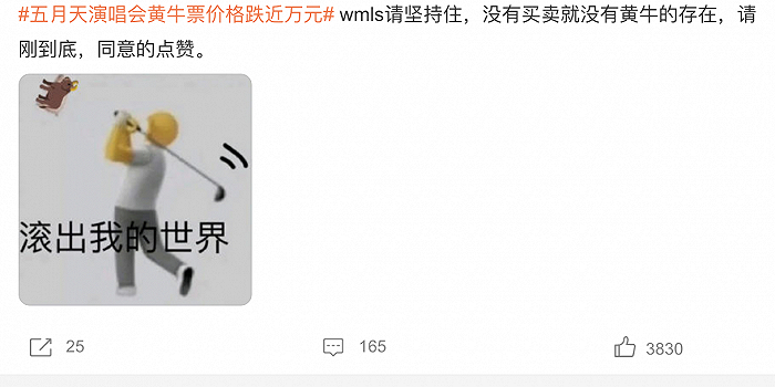 因歌迷团结抵制,黄牛票价格跳水。据北京商报报道,开票当天报价18800元的第一排门票,如今已跌至10800元,直降8000元,而1855元这一档位不可任选座位的门票,大批黄牛如今报价在3000元左右。不少粉丝在微博呼吁没有买卖,就没有黄牛票,粉丝与黄牛可谓两败俱伤。
