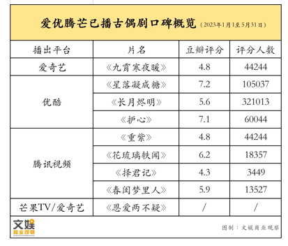 一方面,古偶题材的观众接受风险和“压剧”风险依旧较高。据文娱君统计,截止5月底,在爱优腾芒已播的9部古偶剧中有6部口碑在及格线之下;而自21年8月杀青至今,腾讯视频的S+级古偶项目《玉骨遥》已积压近两年。