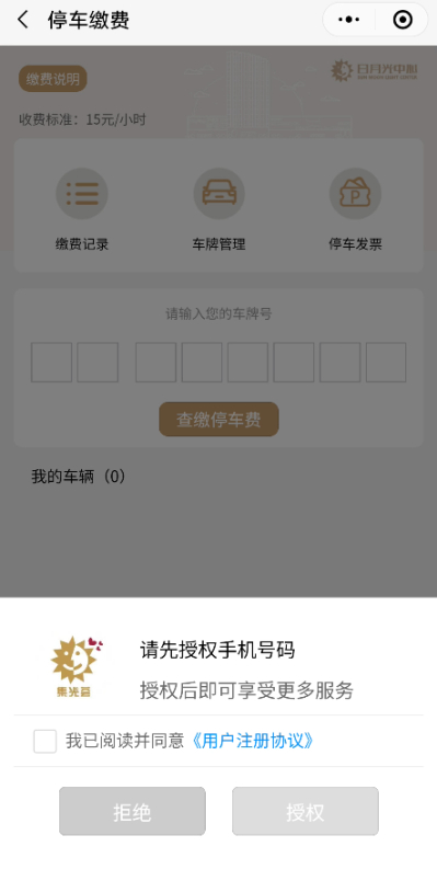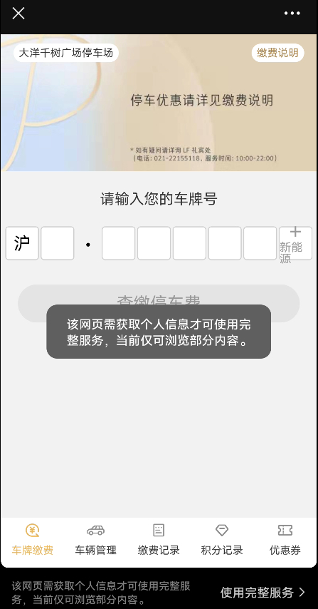 在“大洋千树广场”的停车场扫码后,弹出的页面无法直接输入车牌号,消费者需要提供微信昵称和头像后才可以缴费。