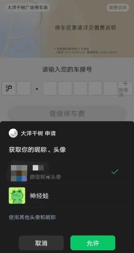 “大洋千树广场”和“宝杨宝龙广场”的停车场扫码后必须先提供微信昵称、头像再缴费。