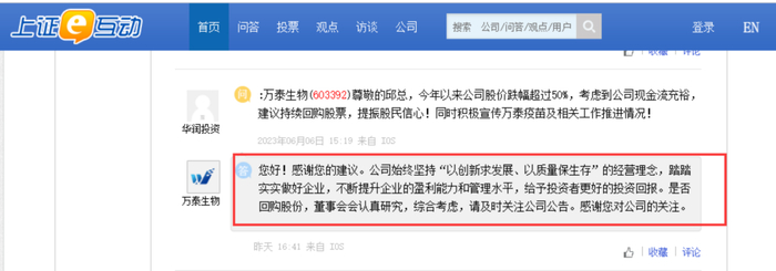 万泰生物昨天下午在上证e互动平台回复投资者提问时表示,公司始终坚持“以创新求发展、以质量保生存”的经营理念,踏踏实实做好企业,不断提升企业的盈利能力和管理水平,给予投资者更好的投资回报。对于是否回购股份,公司表示,董事会会认真研究,综合考虑。