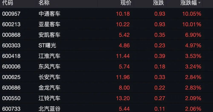 整车制造方面,中通客车、亚星客车涨停,安凯客车涨近7%。