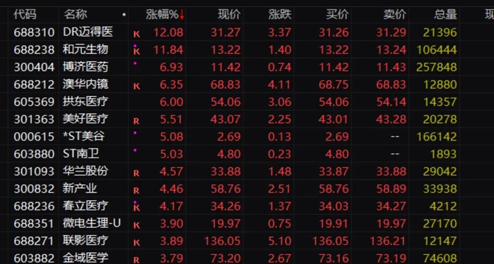 和元生物盘中涨幅超过15%。博济医药、澳华内镜等多股盘中大幅上涨。