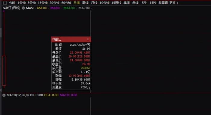 新股豪江智能上午盘中涨幅一度接近130%。