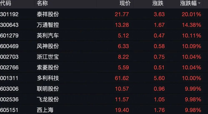 汽车产业链板块早盘走强。Wind行情数据显示,截至午间收盘,汽车零部件指数涨1.33%,汽车指数涨1.22%。板块内个股方面,泰祥股份“20cm”涨停,万通智控涨超14%。英利汽车、风神股份、浙江世宝、索菱股份等多股涨停。