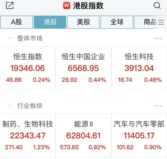 港股方面,今日三大指数均小幅上涨,生物制药、能源、汽车板块涨幅居前。