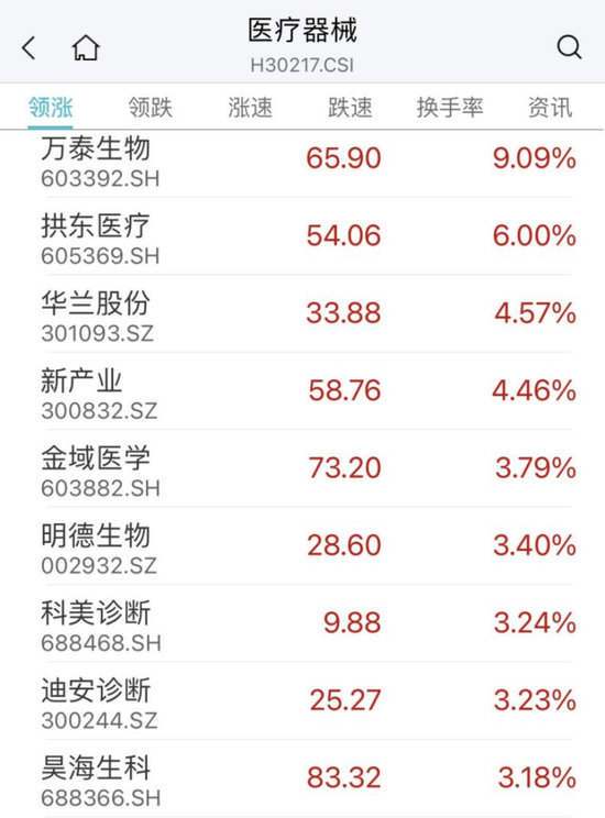新冠抗原检测、医疗服务、医疗器械等板块震荡拉升,万泰生物涨超9%,澳华内镜、美好医疗、新产业等跟涨。