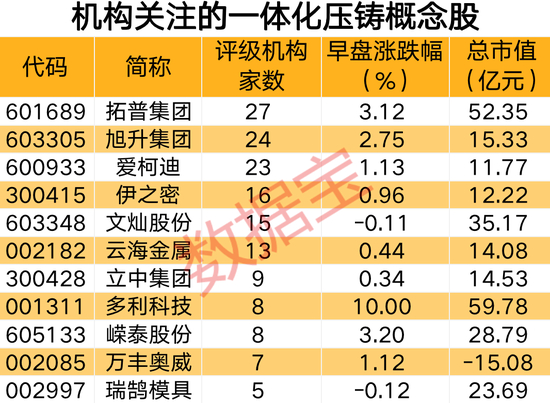 拓普集团、旭升集团和爱柯迪均获20家以上机构评级,早盘分别上涨3.12%、2.75%和1.13%。拓普集团公告显示,公司具备机械、电控、软件的一体化研发整合能力,并且形成了数量众多的发明专利等自主知识产权。