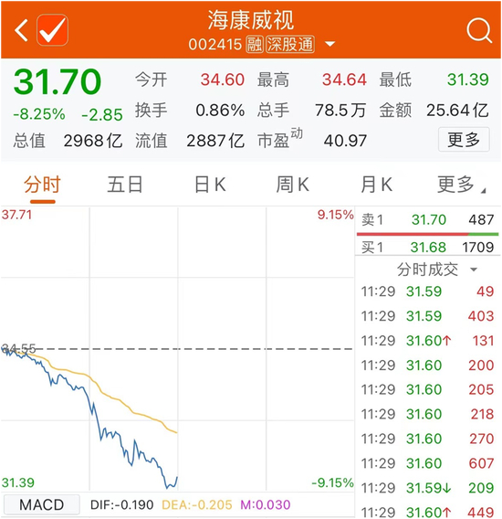 个股方面,3000亿龙头海康威视突发闪崩,盘中一度跌超9%,逼近跌停。截至午间收盘,海康威视跌8.25%,半日成交额25.64亿元,最新总市值2968亿元。