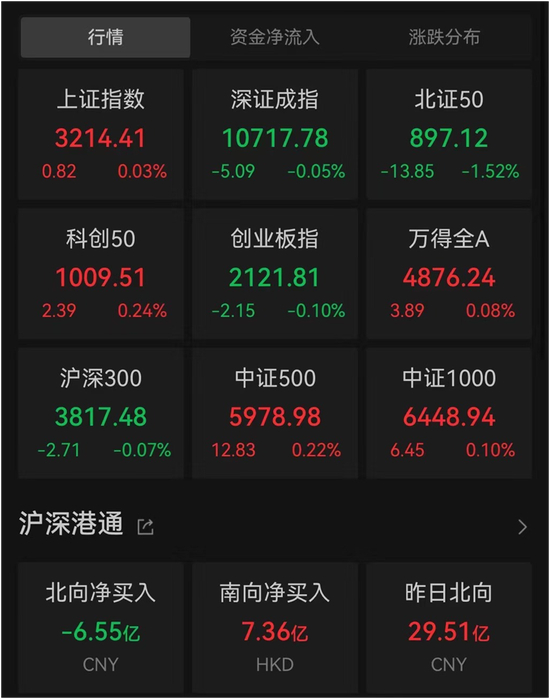 周五,三大指数小幅波动。截至午间收盘,上证指数涨0.03%,深证成指跌0.05%,创业板指跌0.10%。北向资金半日净卖出6.55亿元。