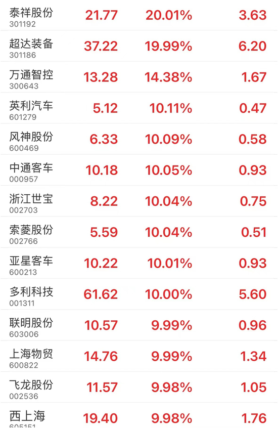 今日早盘,汽车股走势活跃,新能源汽车、汽车零部件等相关板块同步走强。截至午间收盘,泰祥股份、超达装备以20%幅度涨停,万通智控涨超10%,英利汽车、风神股份、中通客车、浙江世宝、索菱股份、亚星客车等10余只个股涨停。