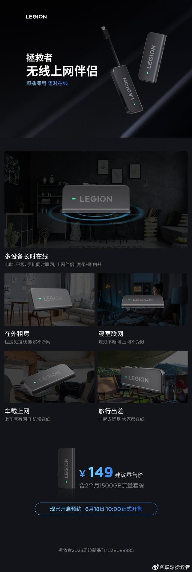 联想推出拯救者无线上网伴侣:50M 带宽速率 送1500G流量,149 元