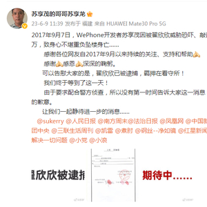 苏享龙在个人微博中写道:2017年9月7日,WePhone开发者苏享茂因被翟欣欣威胁恐吓、敲诈勒索1000余万,致身心不堪重负坠楼身亡……感谢各位网友自2017年9月以来持续的关注、支持和帮助,感谢,感恩,深深鞠躬。可以告慰大家的是,翟欣欣已被逮捕,羁押在看守所!我们终于等到了这一天!由于要求配合警方侦查,所以没有第一时间告诉大家这一消息,在此表示十分歉意……
