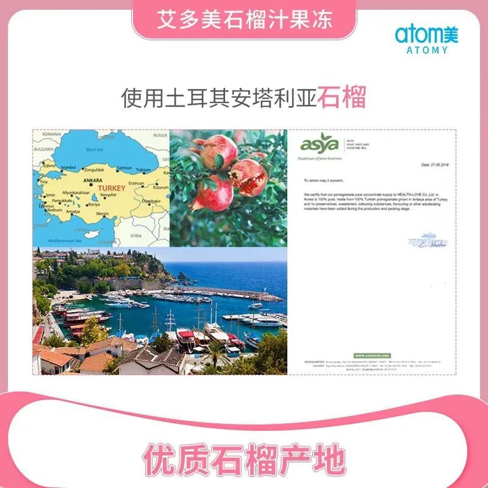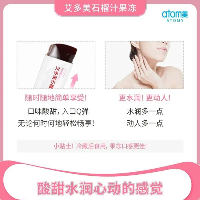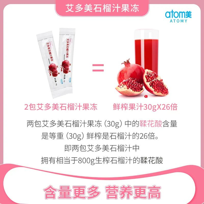 艾多美石榴汁果冻是由韩国科玛BNH的中国子公司江苏科玛生产,原材料取自土耳其安塔利亚的优质石榴,采用浓缩石榴汁生产工艺,经30道工序制造。艾多美石榴汁果冻中的鞣花酸含量是等重鲜榨石榴汁的26倍,在保证石榴汁浓度的前提下,更兼具营养价值。艾多美石榴汁果冻口感酸甜水润Q弹,小包装便携食用,一经上市,深受国内消费者喜爱。