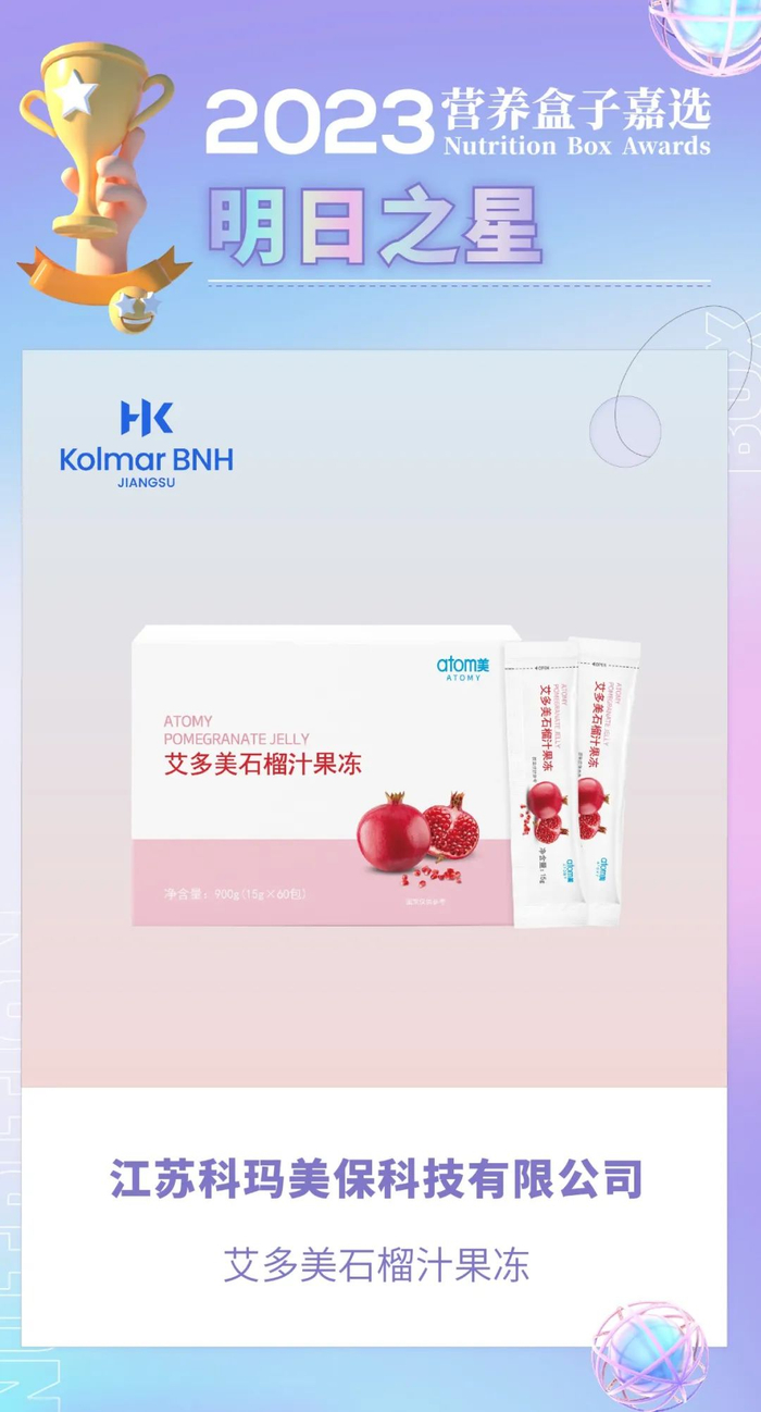 6月7日,第11届新营养大会暨营养盒子颁奖盛典盛大开幕,艾多美石榴汁果冻入围2023营养盒子嘉选新锐榜单,荣获“明日之星”大奖。