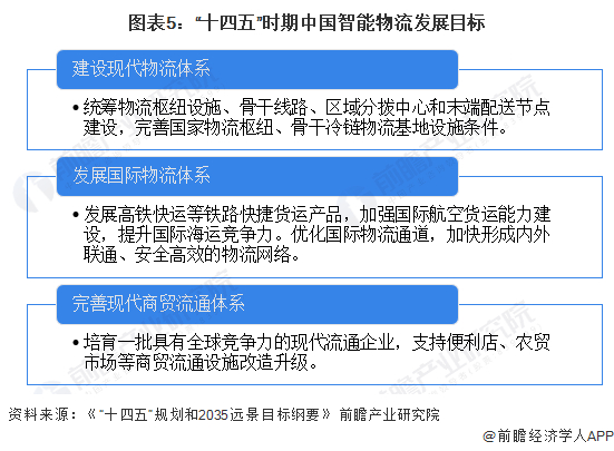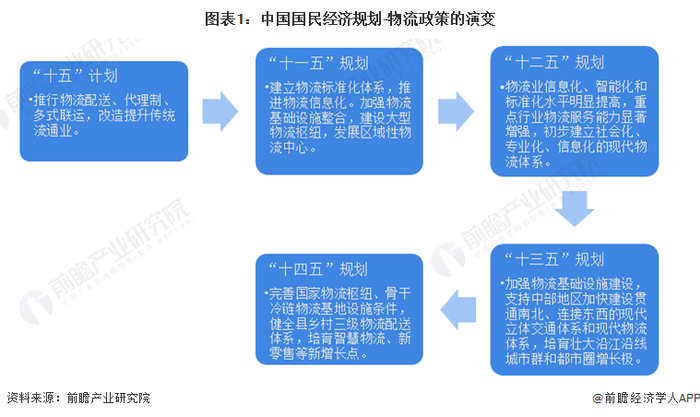 近年来,我国政府不断推动我国物流的发展,提出要发展智能物流建设,国家对智能物流业发展高度重视,从政策上加强引导,加大扶持力度,从“十五”规划的改造传统流通业到“十三五”规划重点建设物流枢纽、综合物流网络再到“十四五”规划重点推进物流信息化发展,政策规划愈发具备前瞻性。