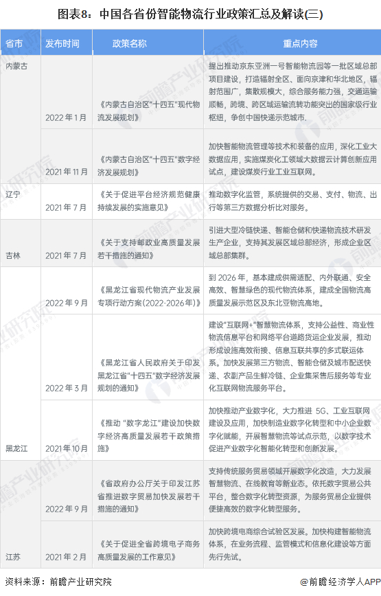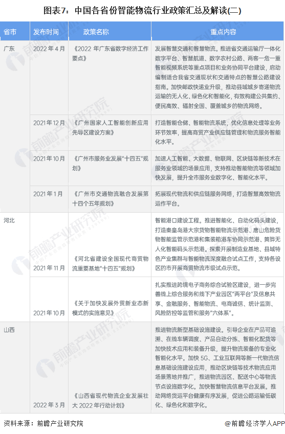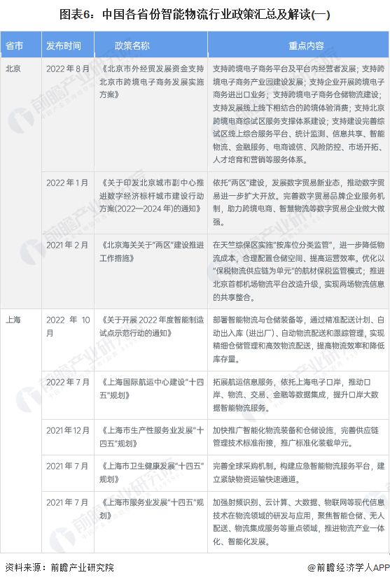 现阶段我国大力发展现代物流体系,大多个省市均出具相关智能物流政策。其中,江浙沪地区着重完善供应链物流支撑体系,加快智慧物流基础设施,优化仓储规划布局;京津冀地区——北京市为代表,大力发展航空科技、航空物流等航空核心产业,打造国家物流枢纽,智慧物流示范区;广东省基于资金优势,推广集约高效的智能物流设备,推动货、车、场等物流要素数字化,支持物流园区智慧化升级。各省智慧物流重点政策具体内容汇总如下: