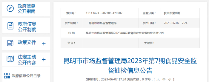 昆明市市场监管局2023年第7期食品安全监督抽检信息公告