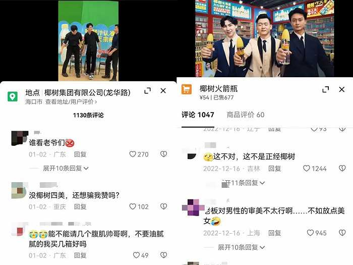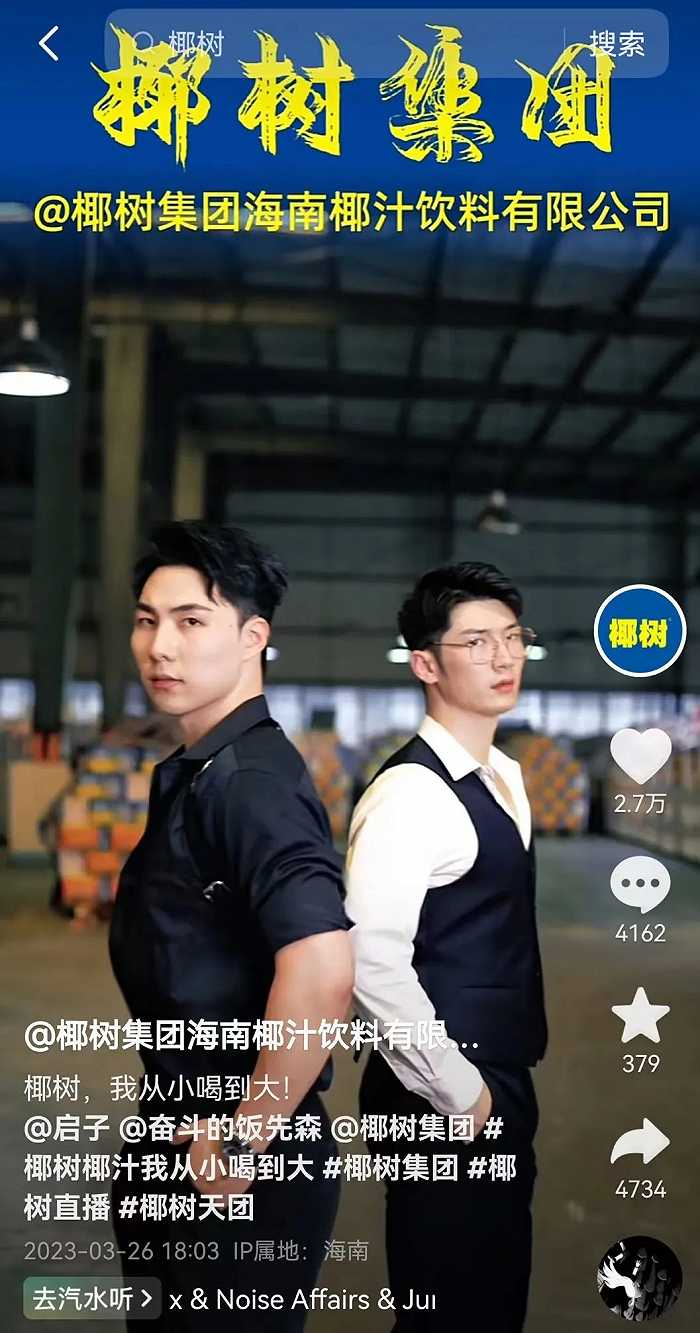 六月一日椰树的线下直播更是大肆发酵。那几日,在商场“六一童心飞扬”的展示板前,男模们欢快地扭动着身姿骑动感单车,对着火箭瓶造型贴身热舞的视频传遍了微博。