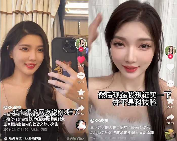 合理怀疑,她是因为这个问题被吐槽过多次。她的个人抖音账号至今置顶了两个视频,一支是“证明我不是科技脸”,另一支主题是“希望大家不要有容貌焦虑”,内容就是在回应“很多问网友说KK胖了,KK该减肥了”。而在小红书上,她的多支视频都会带上“微胖女孩”的标签——哪怕她的身材,在普通人中对比无论如何都算不得“微胖”。