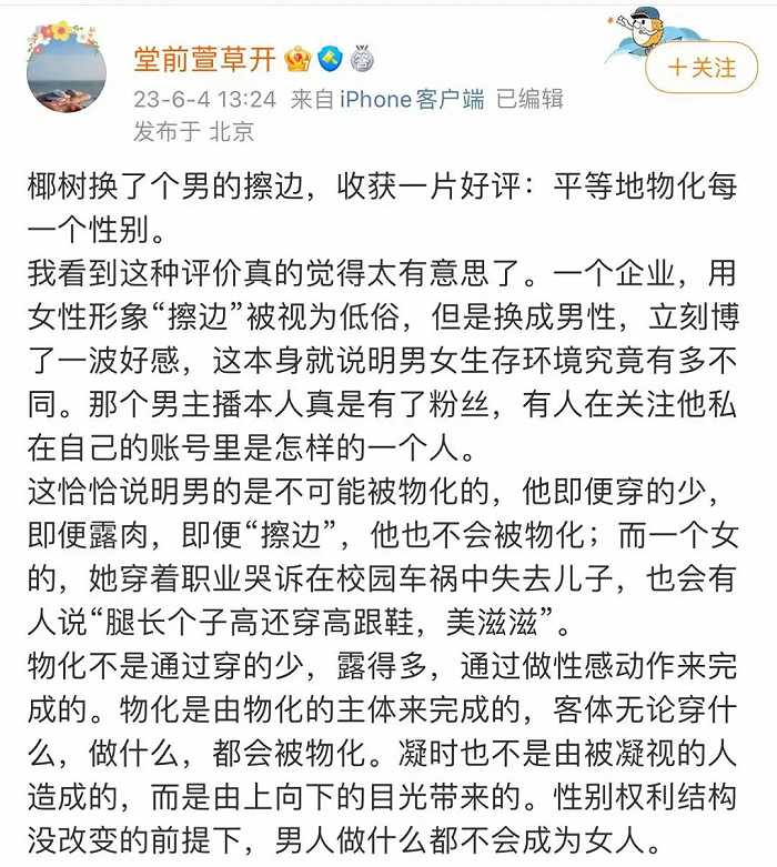 微博博主@堂前萱草开 的一则微博也获得了8.4万的点赞:一个企业,用女性形象“擦边”被视为低俗,但是换成男性,立刻博了一波好感,这本身就说明男女生存环境究竟有多不同。那个男主播本人真是有了粉丝,有人在关注他私在自己的账号里是怎样的一个人。这恰恰说明男的是不可能被物化的,他即便穿的少,即便露肉,即便“擦边”,他也不会被物化。