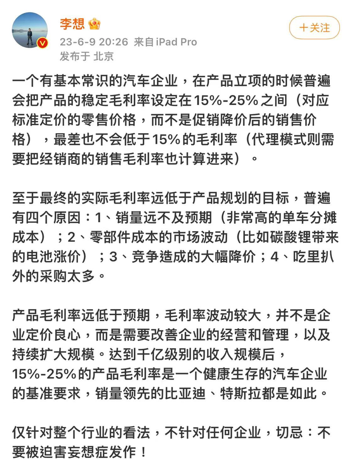 理想汽车CEO李想6月9日在官博表示,一个有基本常识的汽车企业,在产品立项的时候普遍会把产品的稳定毛利率设定在15%-25%之间(对应标准定价的零售价格,而不是促销降价后的销售价格),最差也不会低于15%的毛利率(代理模式则需要把经销商的销售毛利率也计算进来)。